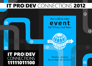 Οπως ειχα προβλεψει στο προ-προηγουμενο post, το Σαββατοκυριακο που μας περασε ημουν στην Αθηνα για την ομιλια μου σχετικα με τις BSODs, στο ItProDevConnections 2012. Λιγο ελλειψε εξαιτιας των spamfilters της Forthnet, να μην λαβω ποτε τα mails του κ. Κλαδάκη και την προσκληση, αλλα ευτυχως ολα πηγαν καλα. Τα slides απο την ομιλια σε pptx και σε pdf μορφη.